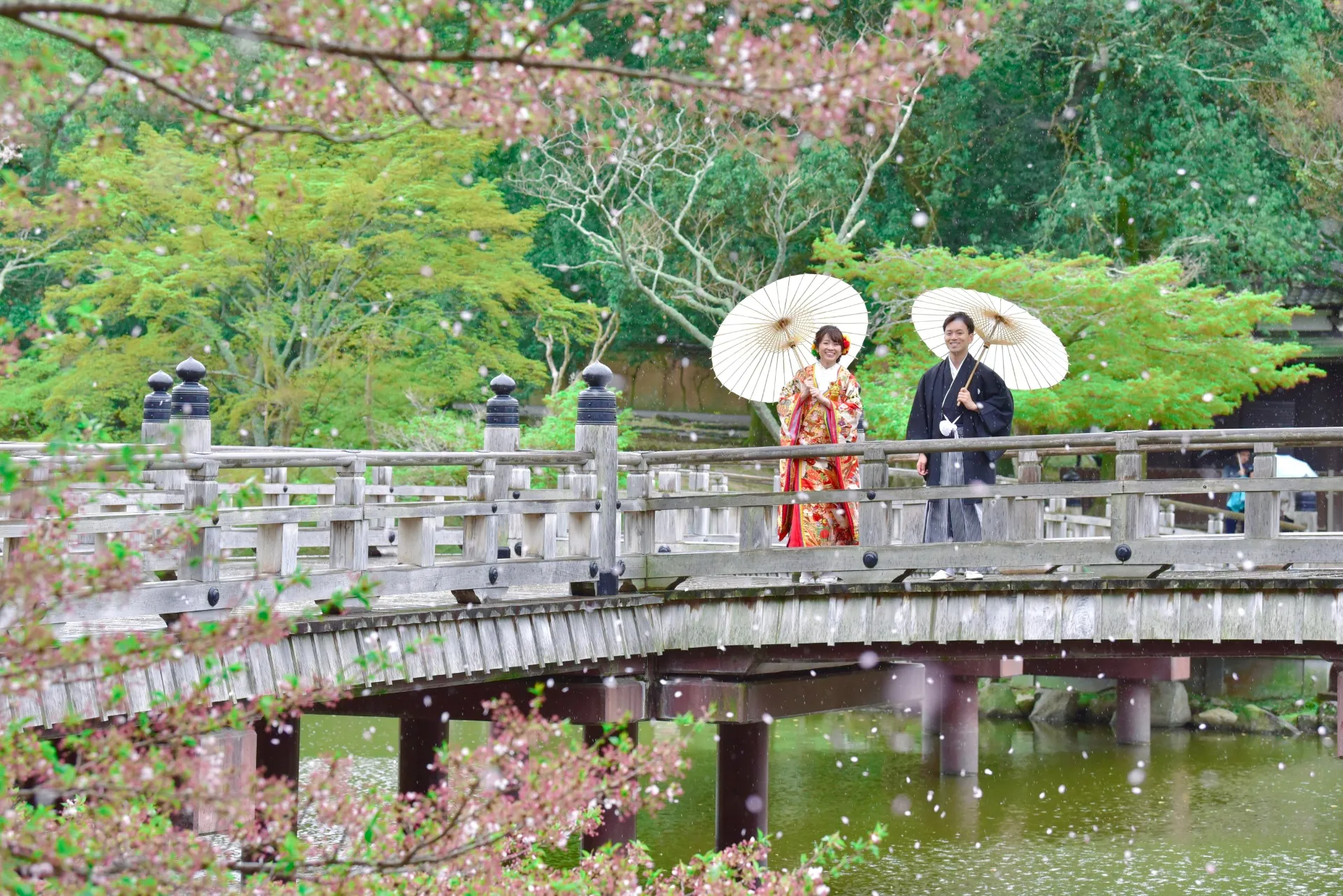雨のなか撮影する場合は、傘は番傘が視覚的にも美しいデザインのものを選ぶことが、撮影の雰囲気を壊さないために役立ちます。