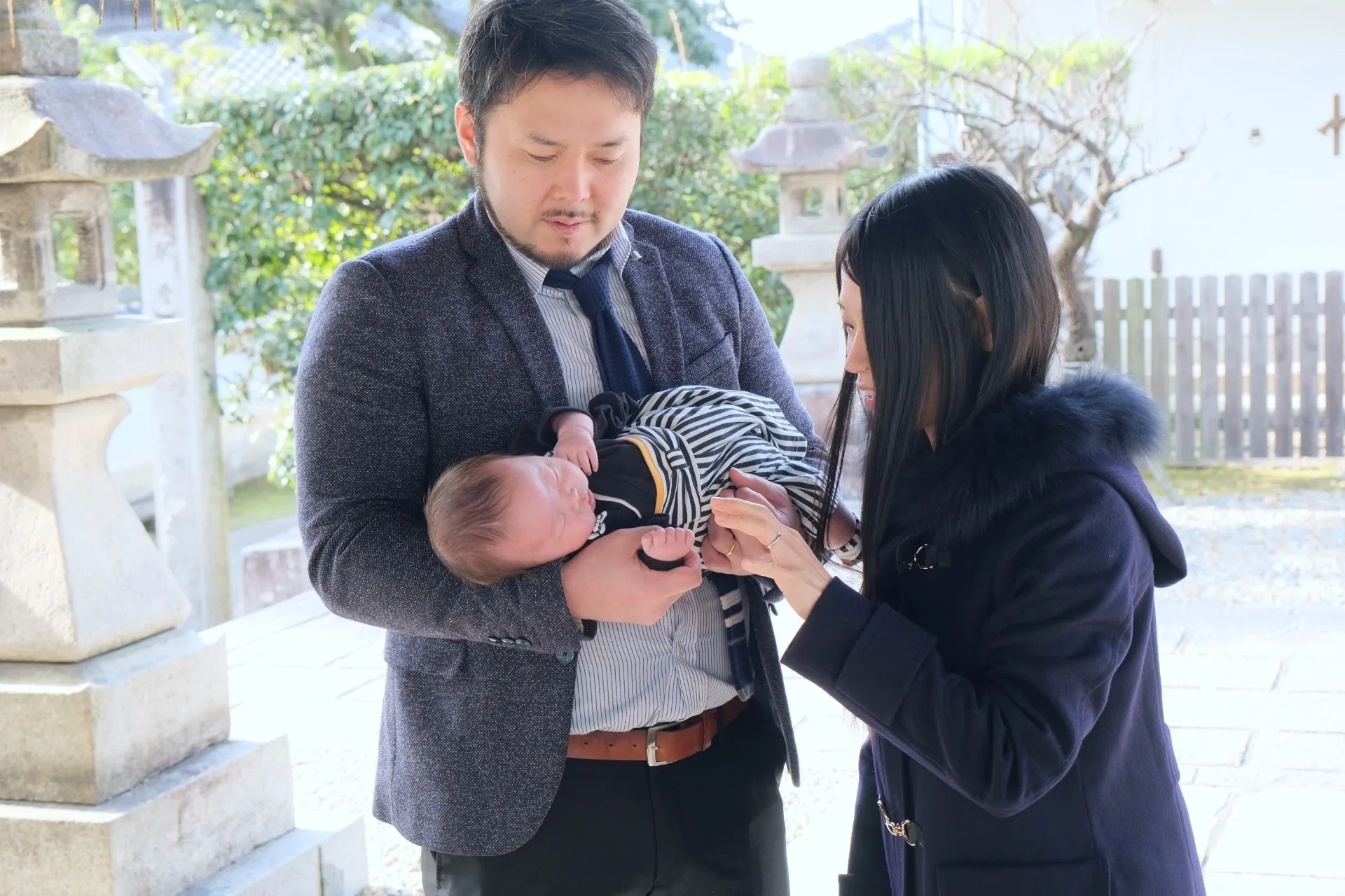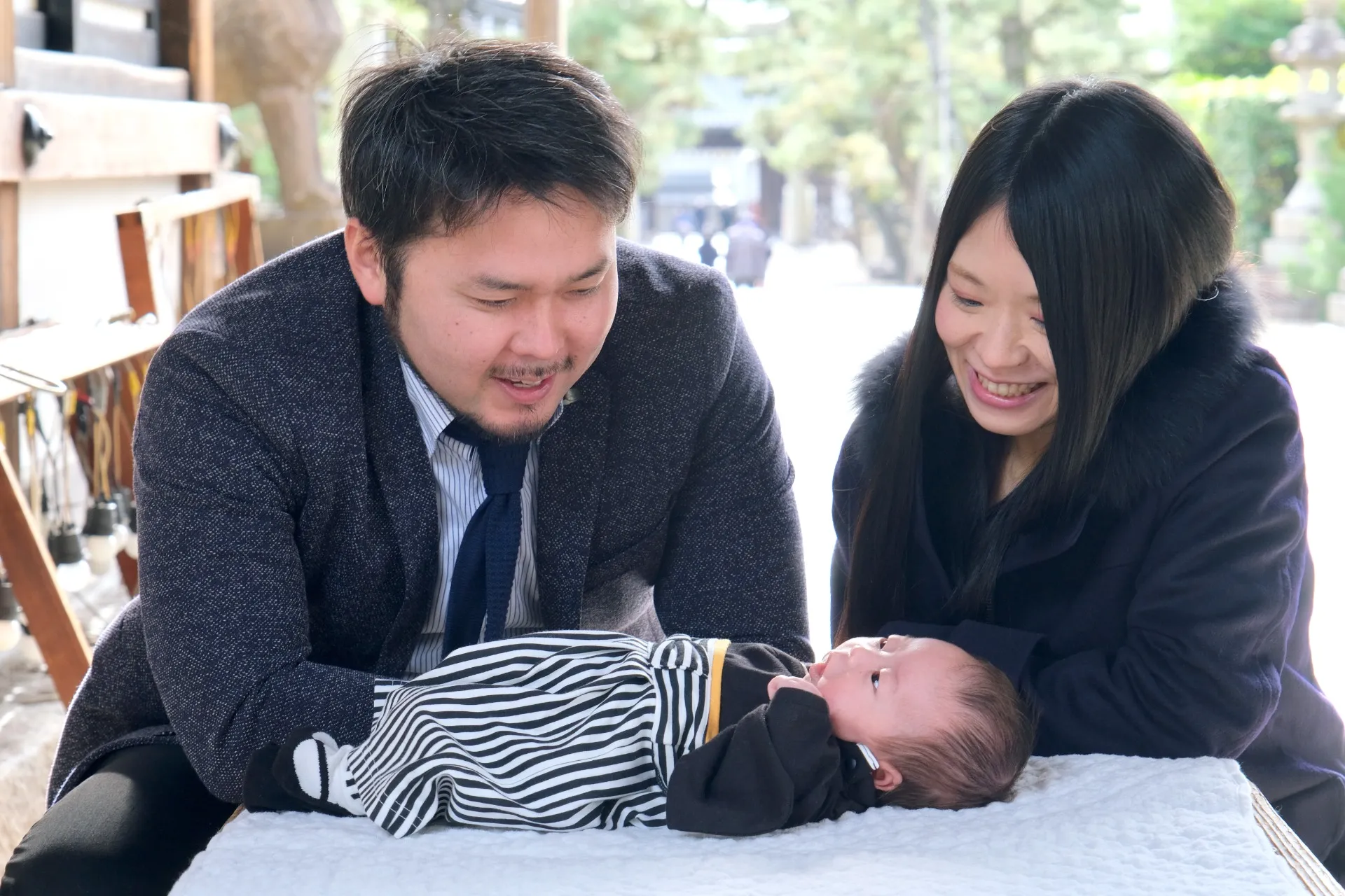 神社の荘厳な雰囲気を活かし、自然光を利用した撮影で赤ちゃんの肌を美しく表現し、温かみのある写真に仕上がります。