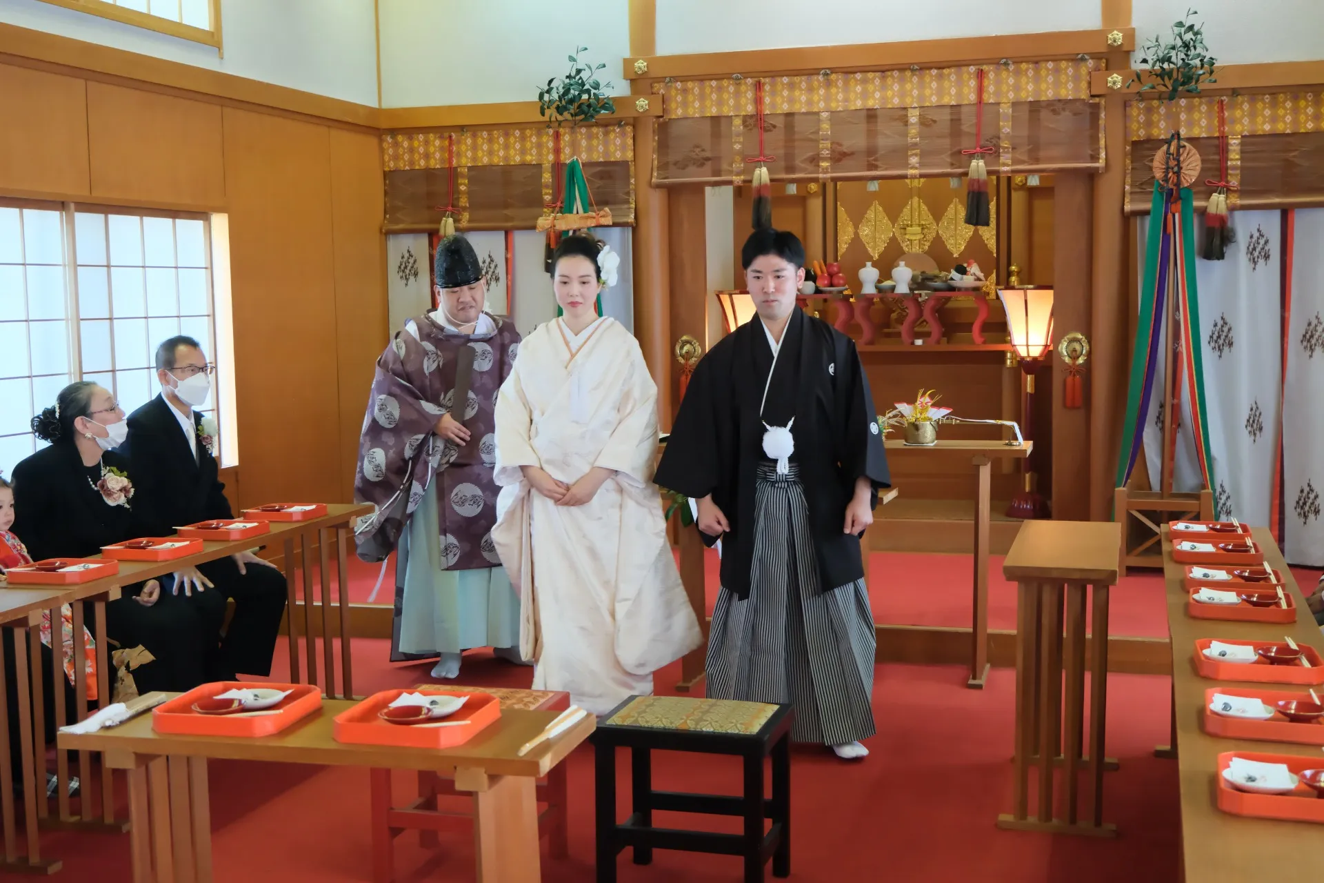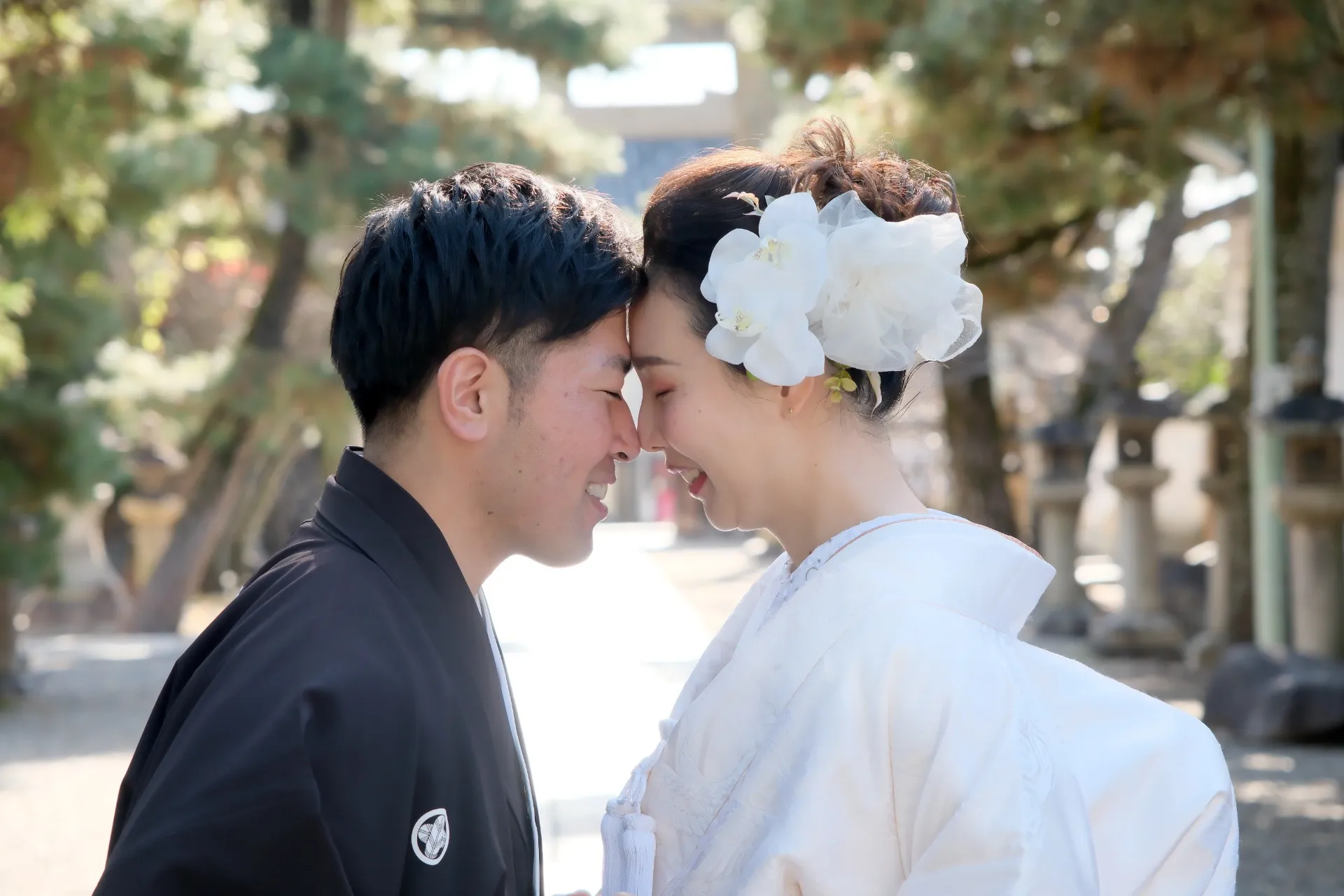 純白の白無垢が映える朱塗りの社殿や古木の緑は、写真に深みと格式を与え、新郎新婦の美しい姿を一層引き立てます。