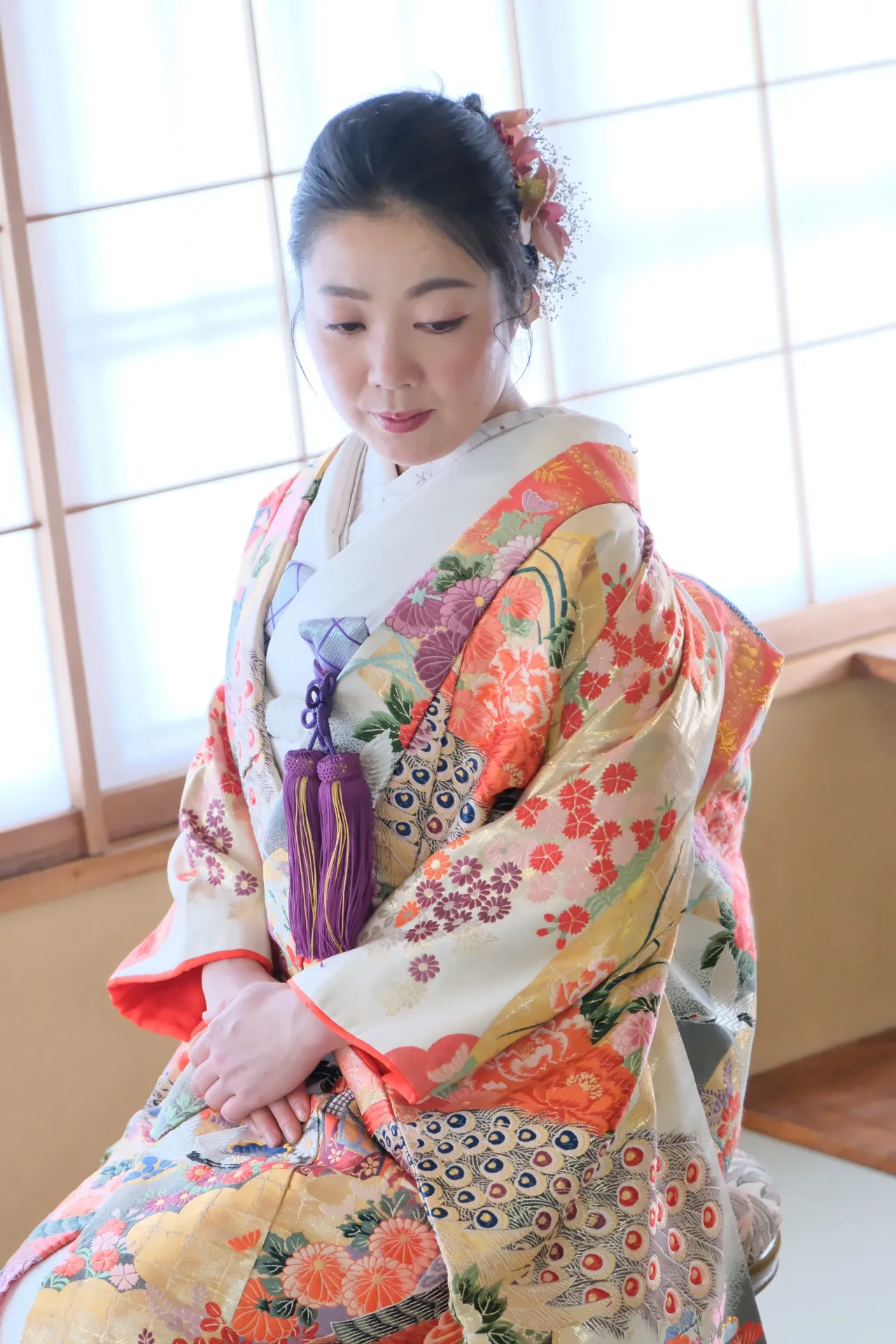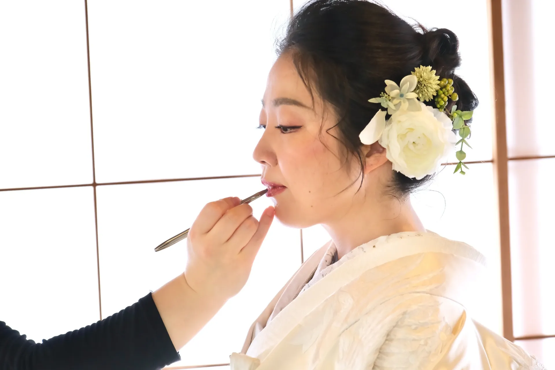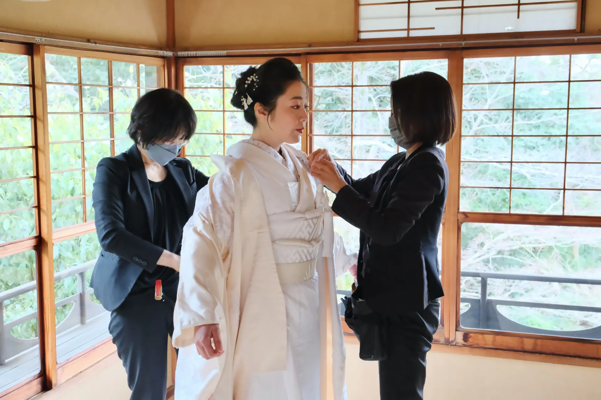桜はまだ咲いておらず、枝の状態でしたが、お支度の場所は、明るく外からの光が沢山入りますし、常緑樹も沢山あるので、しっとりと落ち着いた撮影ができました。