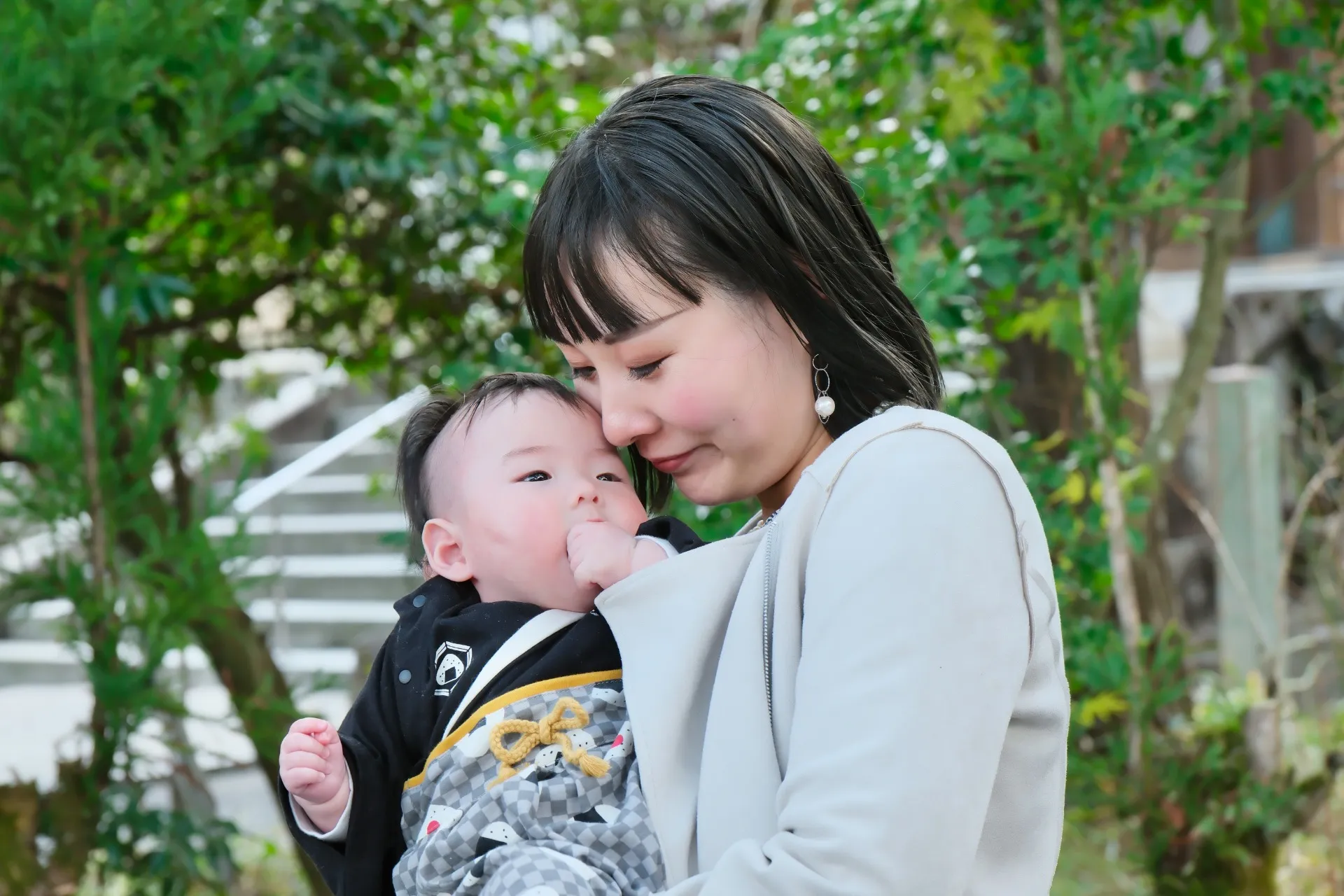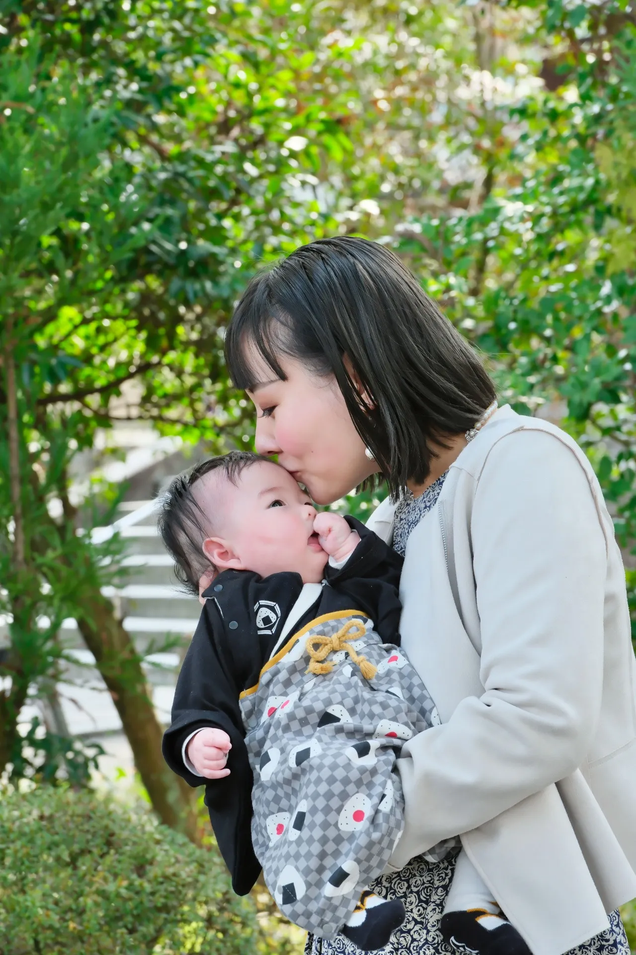 この写真のように落ち着いた緑を背景にして、赤ちゃんとお母さんの写真を撮るのも素敵です。