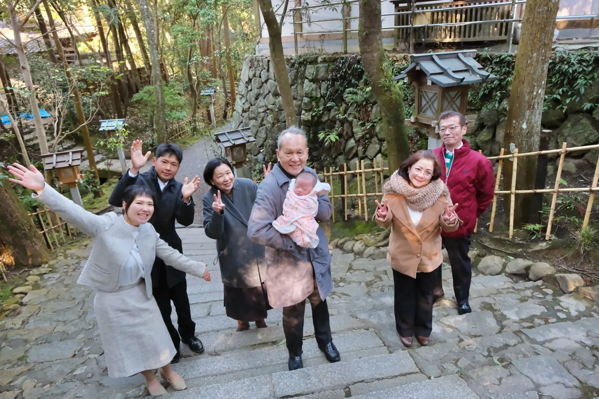 フォトグラファーとしては、赤ちゃんの機嫌や動きに配慮しつつ、普段の自然な姿を捉えることも大切だと思っていますが、ご両親やご家族の笑顔を残すことも大切だと思っています。笑顔がたくさん写った写真を将来に残すことで、大神神社での12月のお宮参り写真は、家族の大切な思い出として心に残ることでしょう。
