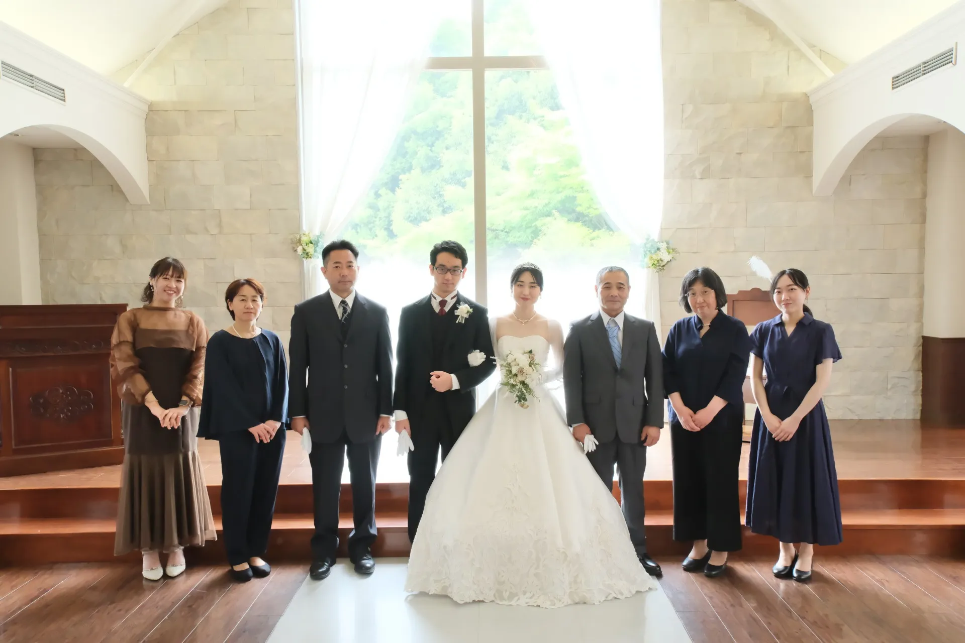 チャペルフォトウエディングに家族を招く最大のメリットは、結婚式のような厳かな雰囲気を写真で再現できる点です。家族に見守られながらドレスアップした姿を残せるため、両親や祖父母、兄弟姉妹にとっても大切な思い出となります。