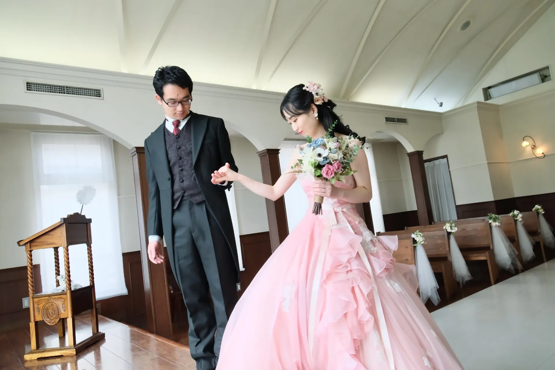 チャペルフォトウエディングは、結婚式を挙げないカップルにも本格的な挙式気分を味わえる人気のプランです。本格的な雰囲気を楽しむためには、チャペルの荘厳な空間や自然光を活かした撮影がポイントとなります。例えば、バージンロードを歩くシーンや、チャペル内での指輪交換風ショットなど、実際の結婚式さながらのシーンをただ撮影するだけでなく、音楽に合わせて実際に行うことで、特別な思い出を残せます。