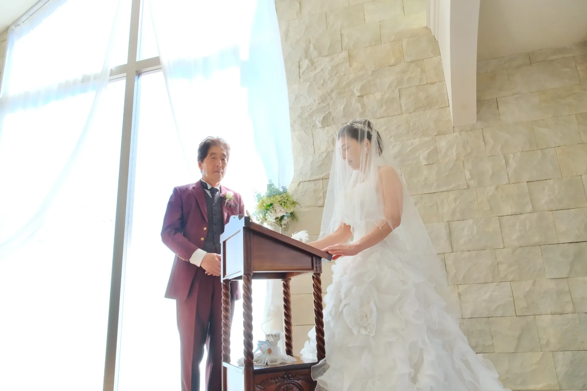 撮影は、入場・指輪交換・ベールアップなど、結婚式さながらの演出を音楽に合わせて再現。まるで本物の挙式のような体験を写真に残すことができます。